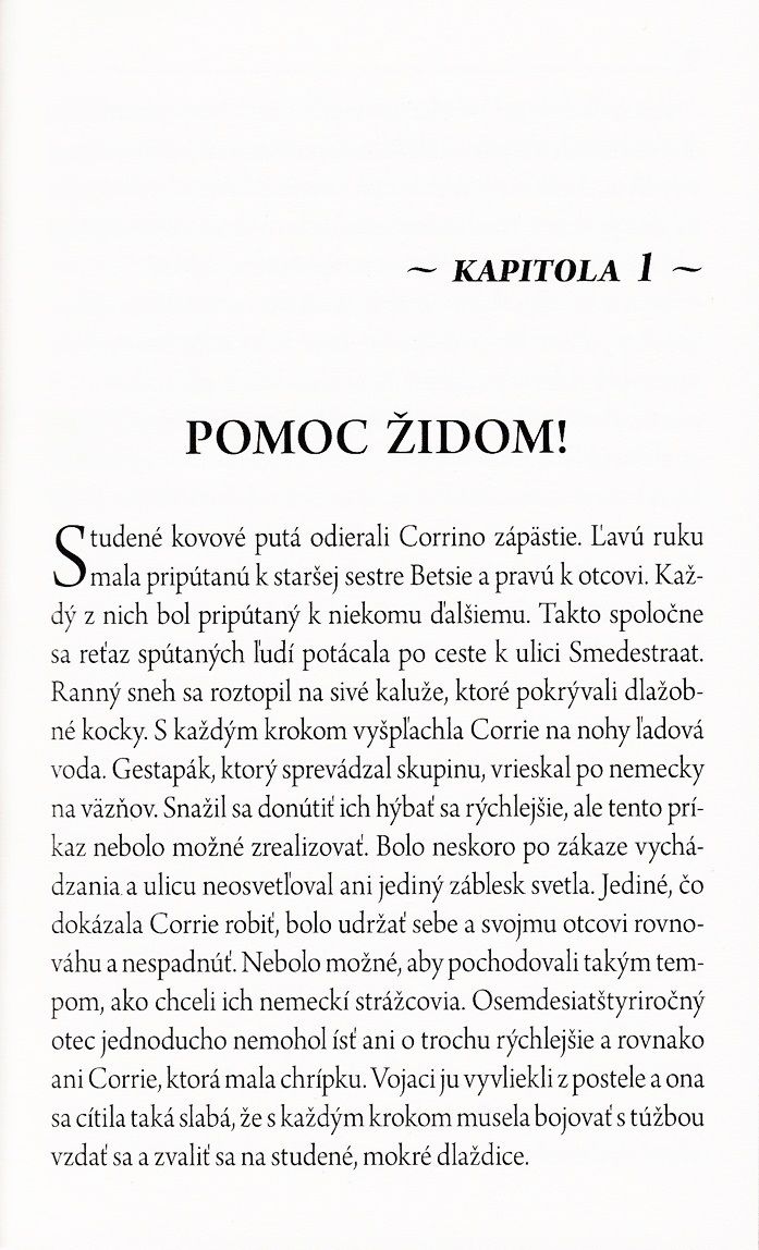Príbeh holandskej kresťanky, ktorá svoju vieru ukázala pri ukrývaní židov počas 2. svetovej vojny, za čo bola poslaná do koncentračného tábora. Po vyslobodení sa stala príkladom odpustenia iným a cestovaním a svedectvom po celom svete povzbudzovala ľudí dôverovať Bohu.