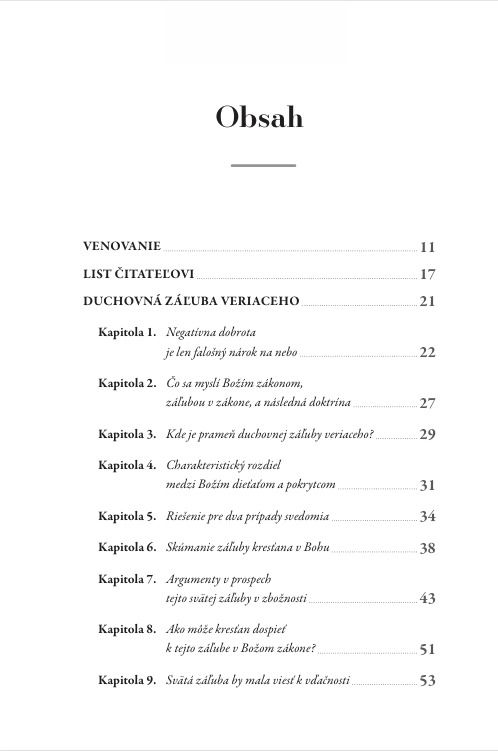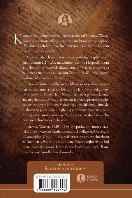 Thomas Watson nádherným a hlbokým spôsobom vysvetľuje, čo to znamená mať záľubu v Bohu a Jeho Slove, a aké životne dôležité je o Bohu a Jeho Slove rozjímať. A potom ukazuje, aké nevyhnutné a súčasne nádherné je mať nepretržité spoločenstvo so živým Bohom. V dnešnej dobe chladného intelektualizmu na jednej strane a plytkej sentimentálnosti na strane druhej je toto storočiami osvedčené a vyvážené dielko známeho puritána veľmi žiaducim liekom.