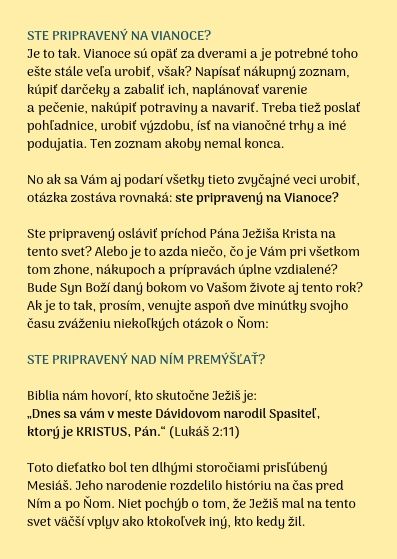 Evanjelizačný leták (formát A6) vhodný na šírenie evanjelia vo vianočnom období. Minimálny počet k odberu je 10ks.